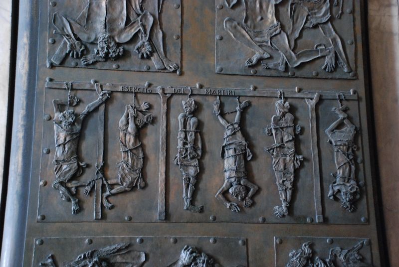 2012 Trip -- Doors of St. Peter's illustrating the fate of the apostles, martyrdom, except for one apostle